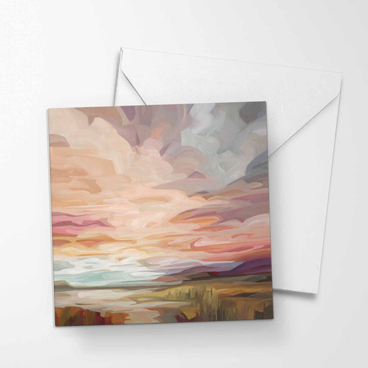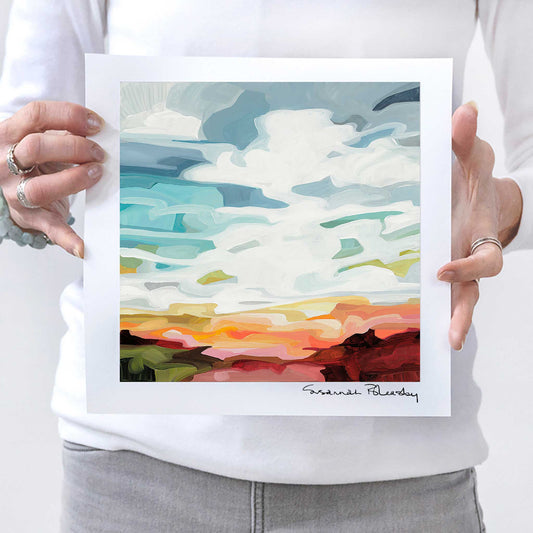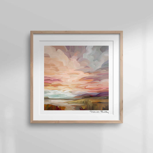You'll often find a bright orange horizon line in my sky paintings. Take a look at how vibrant colours can mingle with bright orange without being overpowered in 'Dawning' or how when you combine soft peachy orange tones with luscious pink and pastels like in 'Belle Weather', you have a dynamic match made in heaven!
