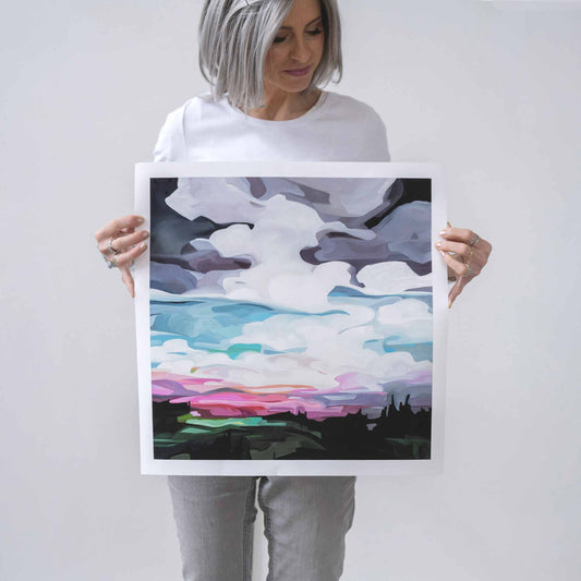 'Painting large' gives me a big, big (!) feeling of freedom. For the 'Forever Skies' collection I set out with big brushes and giant canvases to create skies that felt like forever. Each of the nine stunning fine art prints in the collection has its its own drama, curiosity and tumbles of billowing clouds.