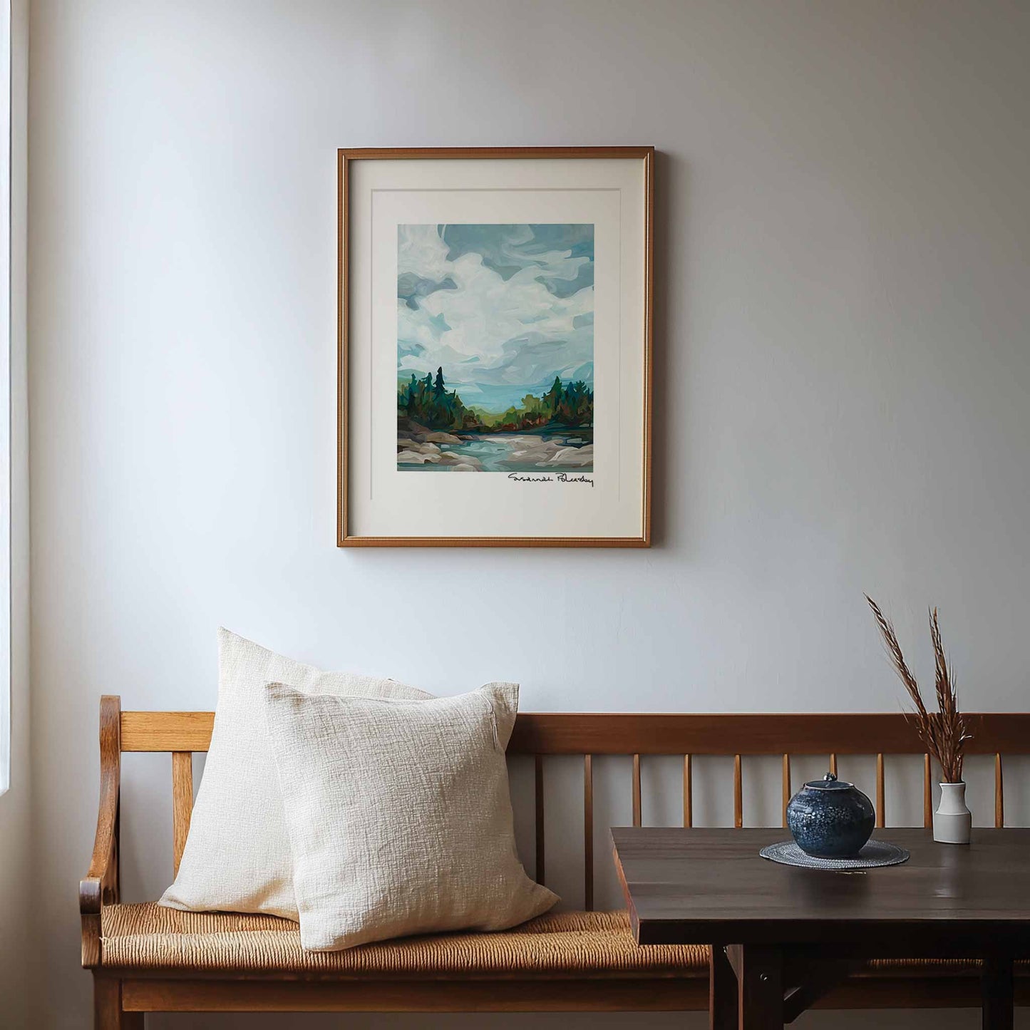 'Stoney Lake' is a vertical art print that feels like a quiet retreat into nature. This peaceful scene captures the gentle flow of a river winding its way through a green spring forest against a gently drifting blue grey sky. Originally an acrylic landscape painting in the 'Lakelands' collection, 'Stoney Lake' continues to be available as a fine art print in its original vertical aspect or as a square crop, perfect for enhancing the ambiance of your home or office.