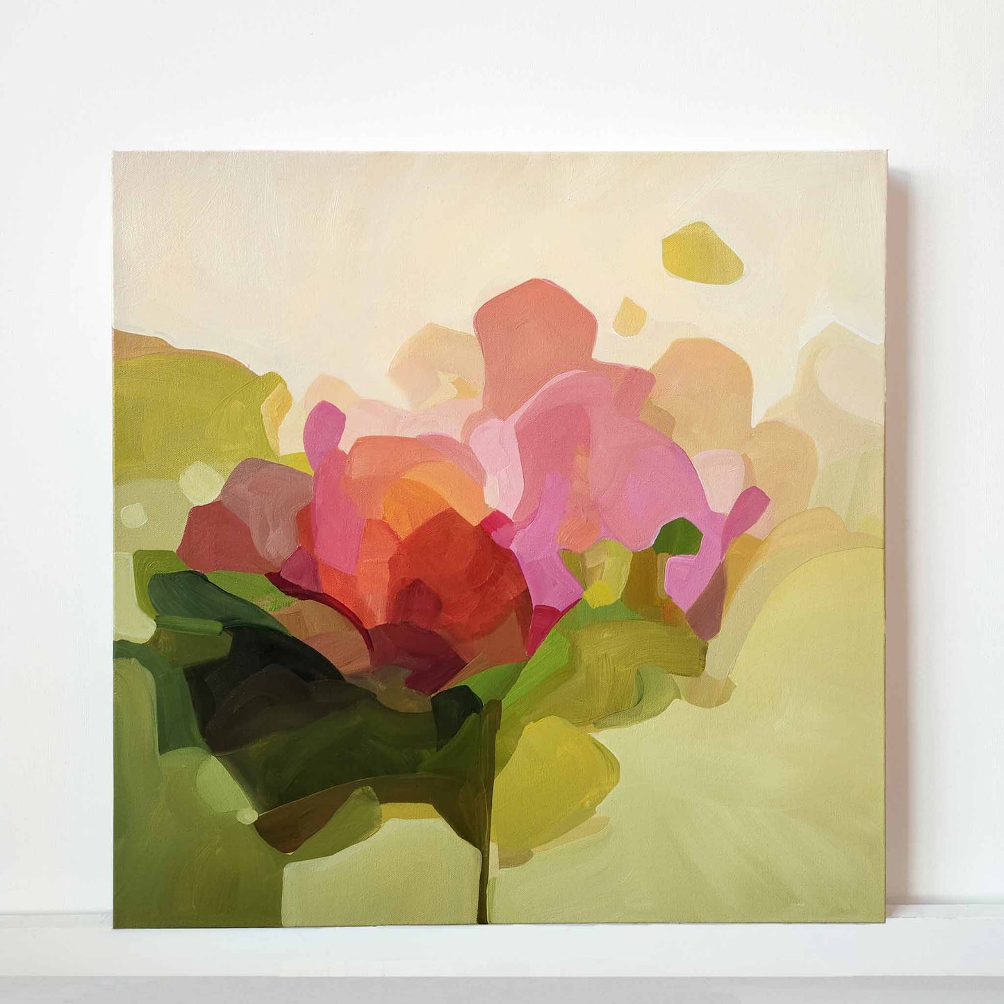 An abstract pink floral painting that feels like summer. Think tangy pink lemondate on a sun-kissed day and the tranquil beauty of garden flowers swaying gently in the breeze. Don't forget your sunglasses, it's a beautifully bright sunshine-y day.