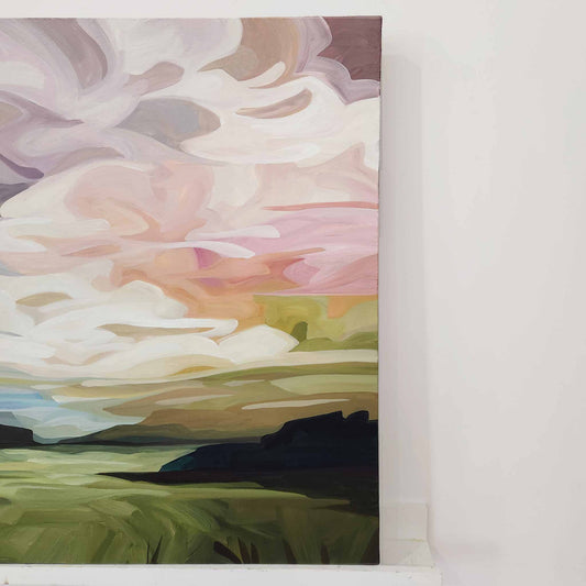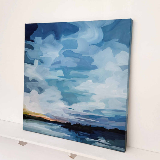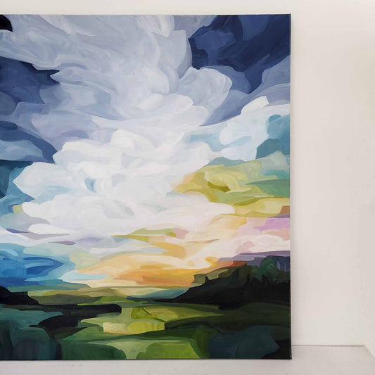 I softened into the flow and followed the moment-to-moment evolution of each painting, letting the drips and splodges be my guide. Each unexpected and unplanned brushstroke felt like a delightful breadcrumb, leading me to the next, unveiling the path ahead. I reveled in this process, hour after hour, simply delighting in the journey and watching these skies evolve until I arrived at the final view, experiencing a deeply satisfying feeling of having found what I was looking for.