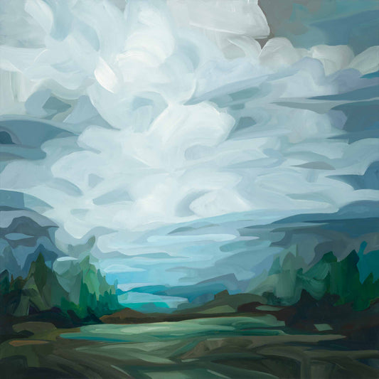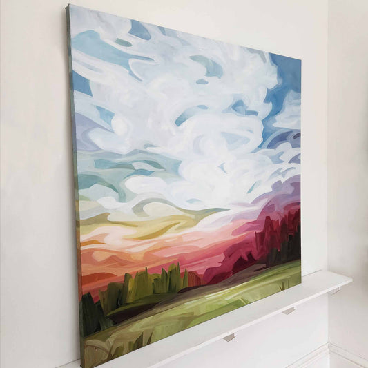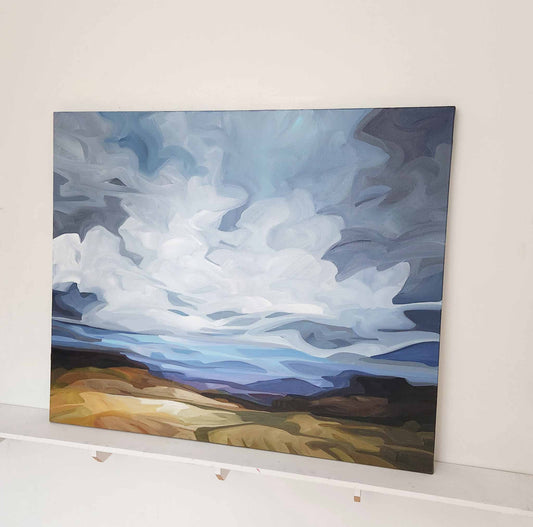 A collection of original paintings that gathers ideas and color into one cloud-filled celebration of the kind of landscapes I love. From a bright spring dawning over the land, to a playful rainbow sky lighting up the world, to blustery clouds rolling in over a deep blue lake, this collection holds it all. As always, there's hope on the horizon and dreams that begin where the land ends.