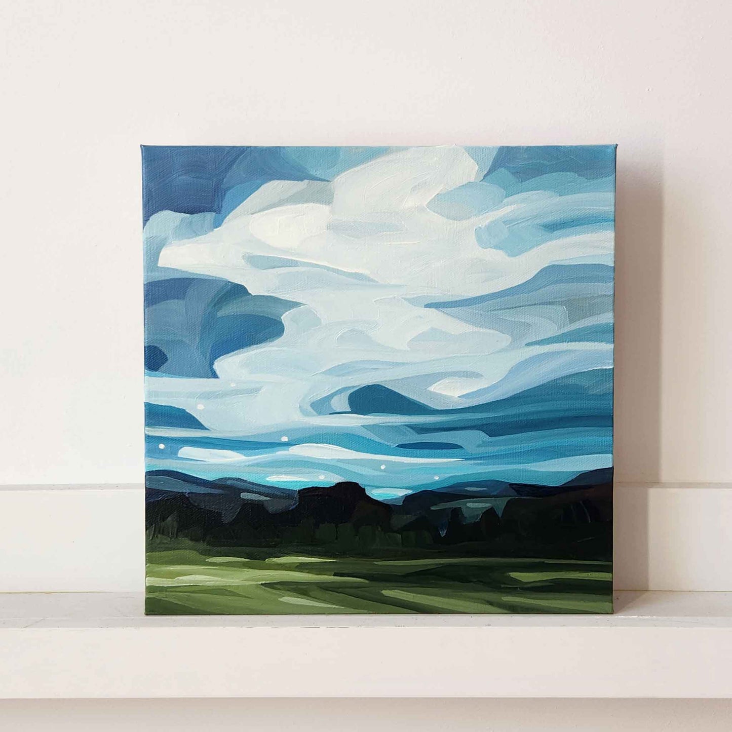 You know that wonderful sense of calm that comes after an afternoon spent outdoors? In this small abstract landscape painting, I tried to capture all those feelings: the scale of a big sky, the feeling of a wide-open landscape before you, and a forest on the horizon that is your destination.