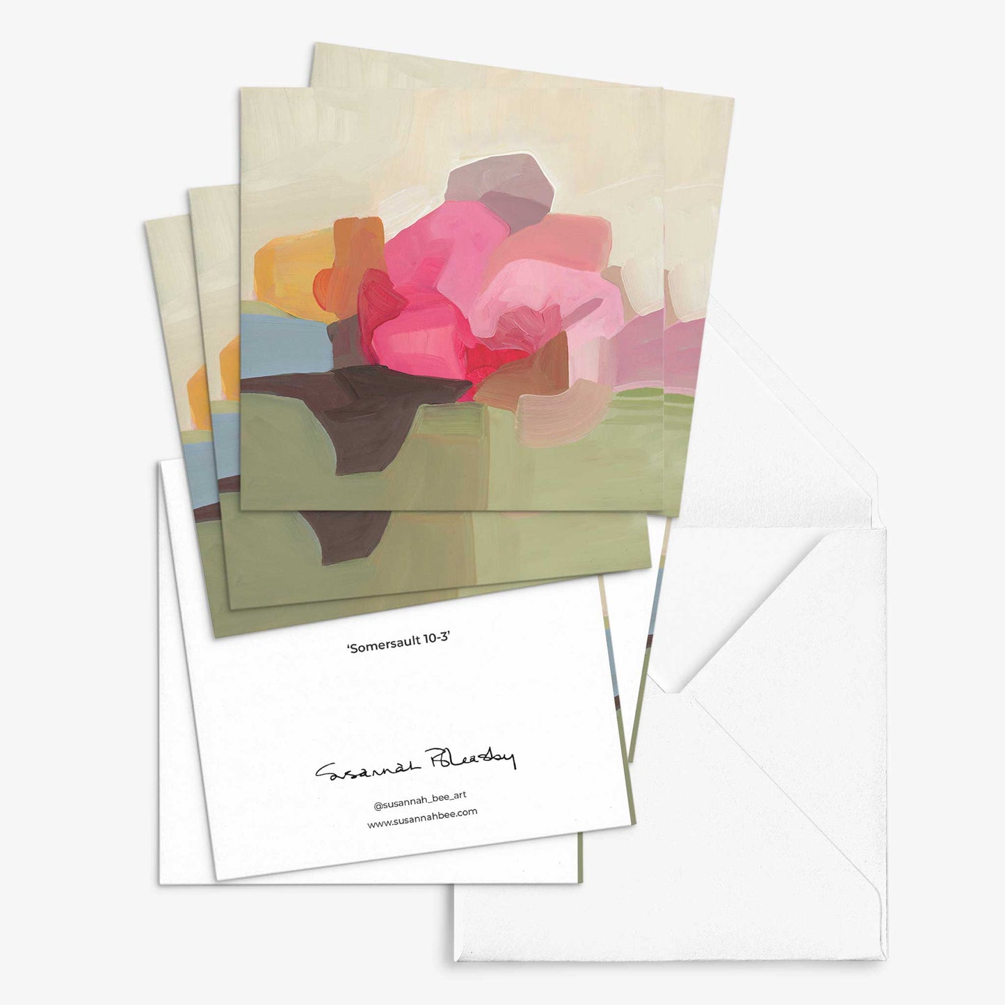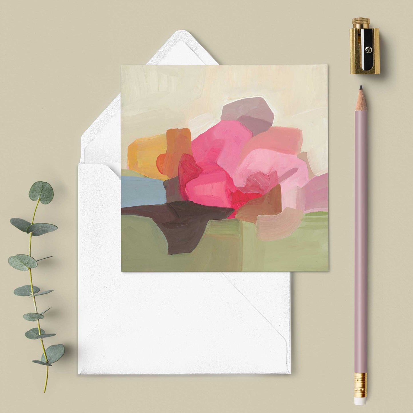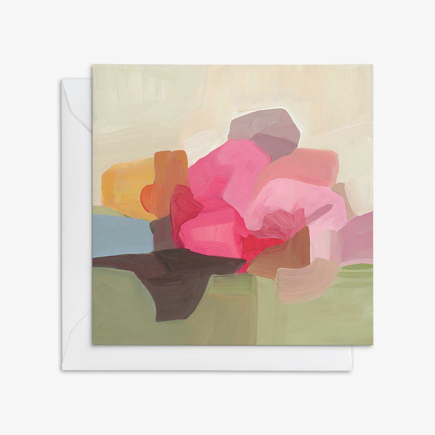 The abstract painting on this joyful art card hits all the notes. It has a hint of sunset, a touch of floral, and a whisper of quiet contemplation while joyfully smiling in full colour. The clean lines of the brushstrokes and interlocking abstract shapes blend to convey a contemporary sense of style that radiates a lively presence.