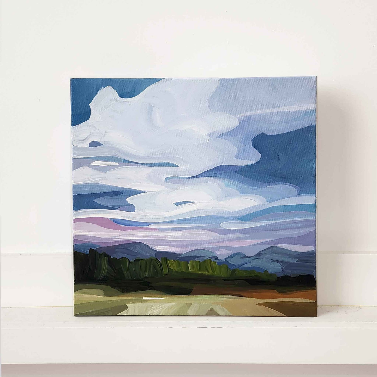 The mauve light of approaching sunset is creeping in on an afternoon blue sky, and soft white clouds float above a mountain landscape on the horizon. It's a colour palette that mixes easily into a gallery wall.