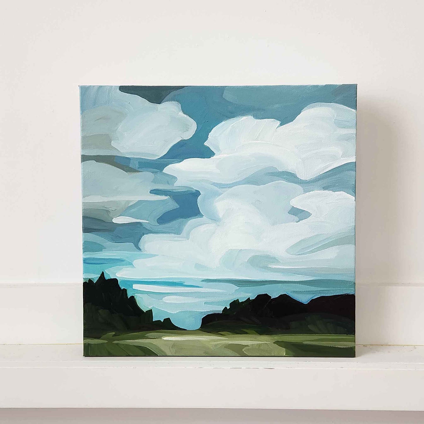 A beautiful and serene summer sky and forest landscape painting captured on a small canvas.