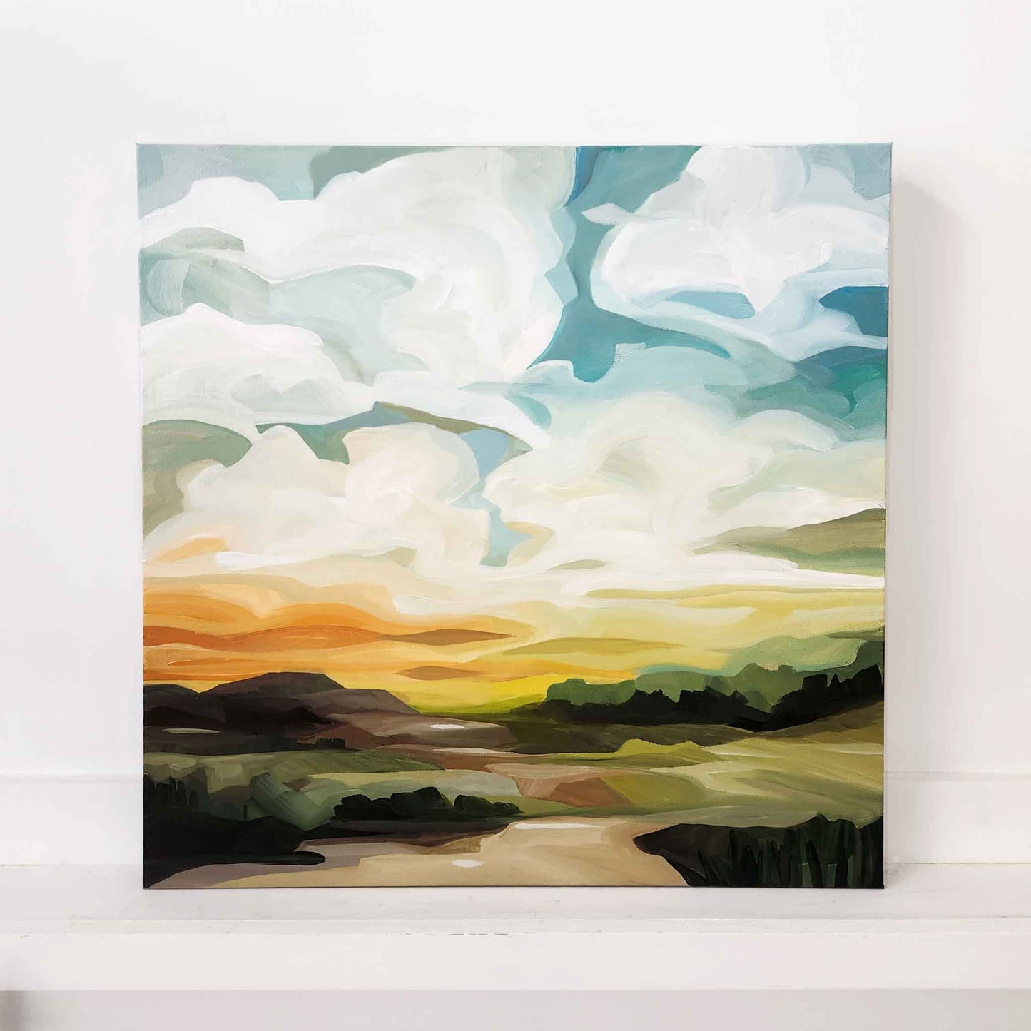 Sunrise? Sunset? I don't think it really matters. What matters is the peaceful way this abstract landscape painting feels. The solitude. The warmth. The expansive beauty of wide-open view under a big breezy sky.