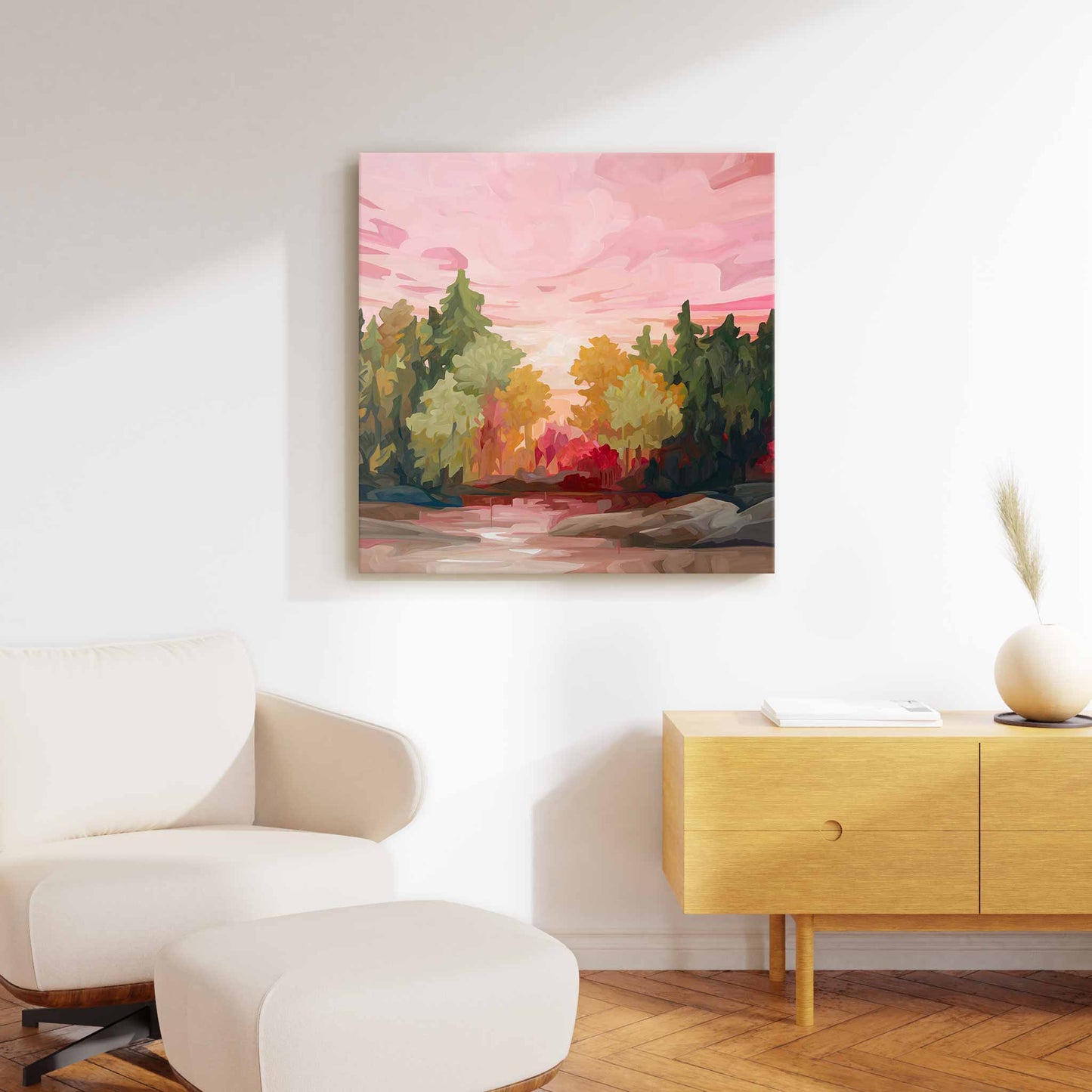 A fine art print created from the fall forest painting 'Rosewater', one of the largest abstract landscape paintings in the 'Lakelands' collection. A view reminiscent of an October afternoon hike, this forest is a wonderful setting for the imagination to wander. In a secluded clearing, the quiet mind will notice the shades and hues of an autumn color palette and soft light filtering through the trees.