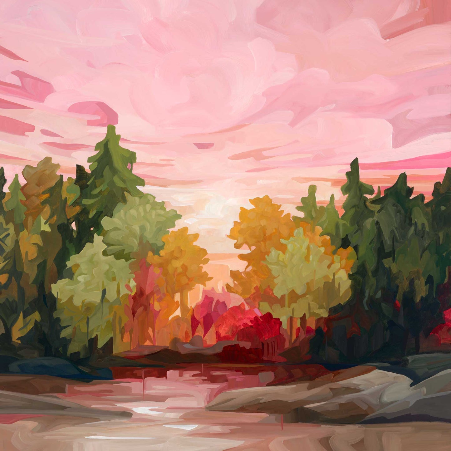 A collection of woodland landscapes wouldn't be complete without a touch of autumn, and it wouldn't be MY autumn without a little sass. I loved the creative challenge this idea presented: how to capture an image of the fall season in a way that feels original and unique to me? Why a massive dose of rose pink of course! Along the way, while painting this uninhibited exploration of an autumn color palette, the perfect name came to mind - 'Rosewater'. The name served as my guide as I finished it to bold, unusual, and beautiful in-its-own-way perfection.
