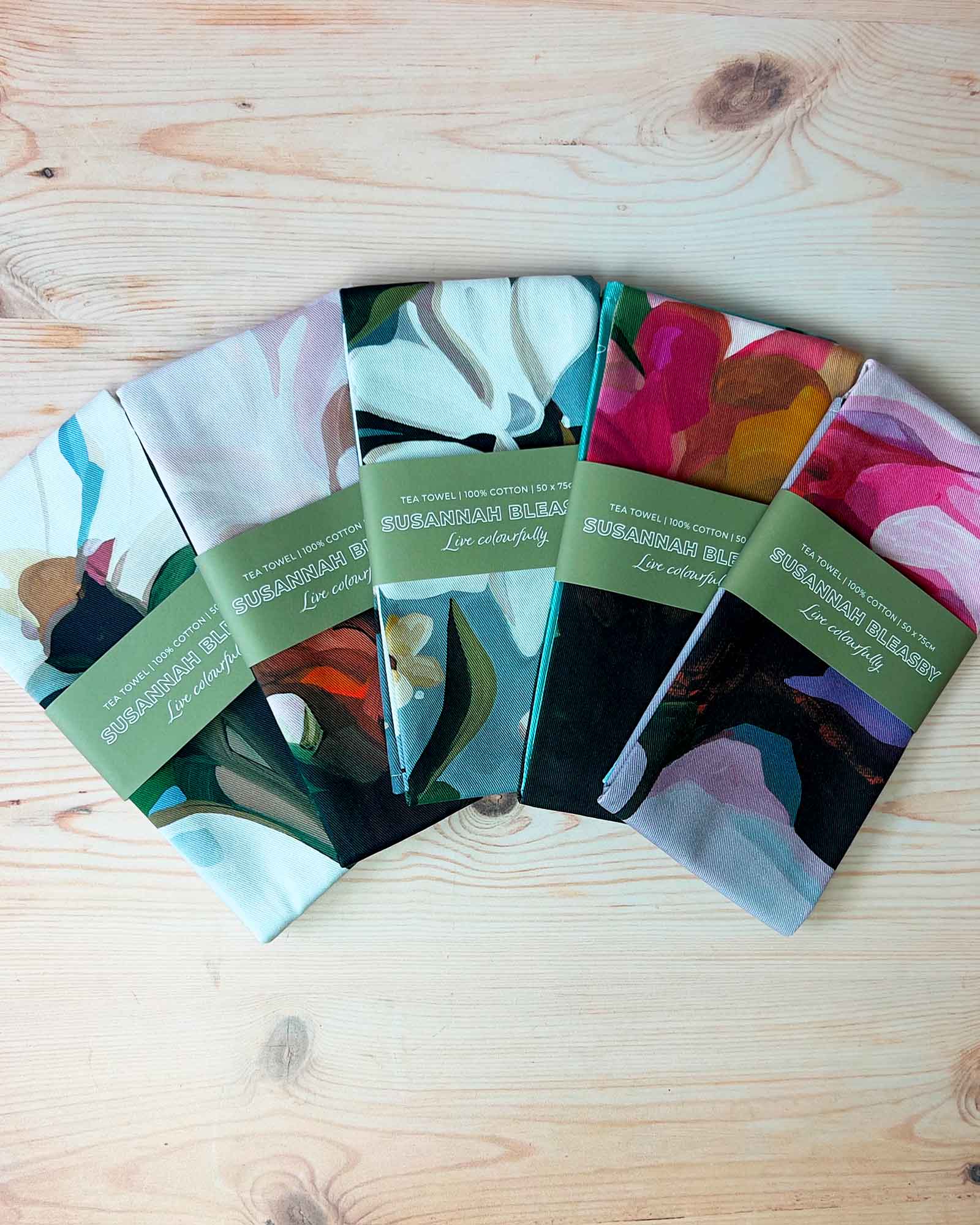 Dress up your kitchen with floral cotton tea towels — yes, art belongs there too!