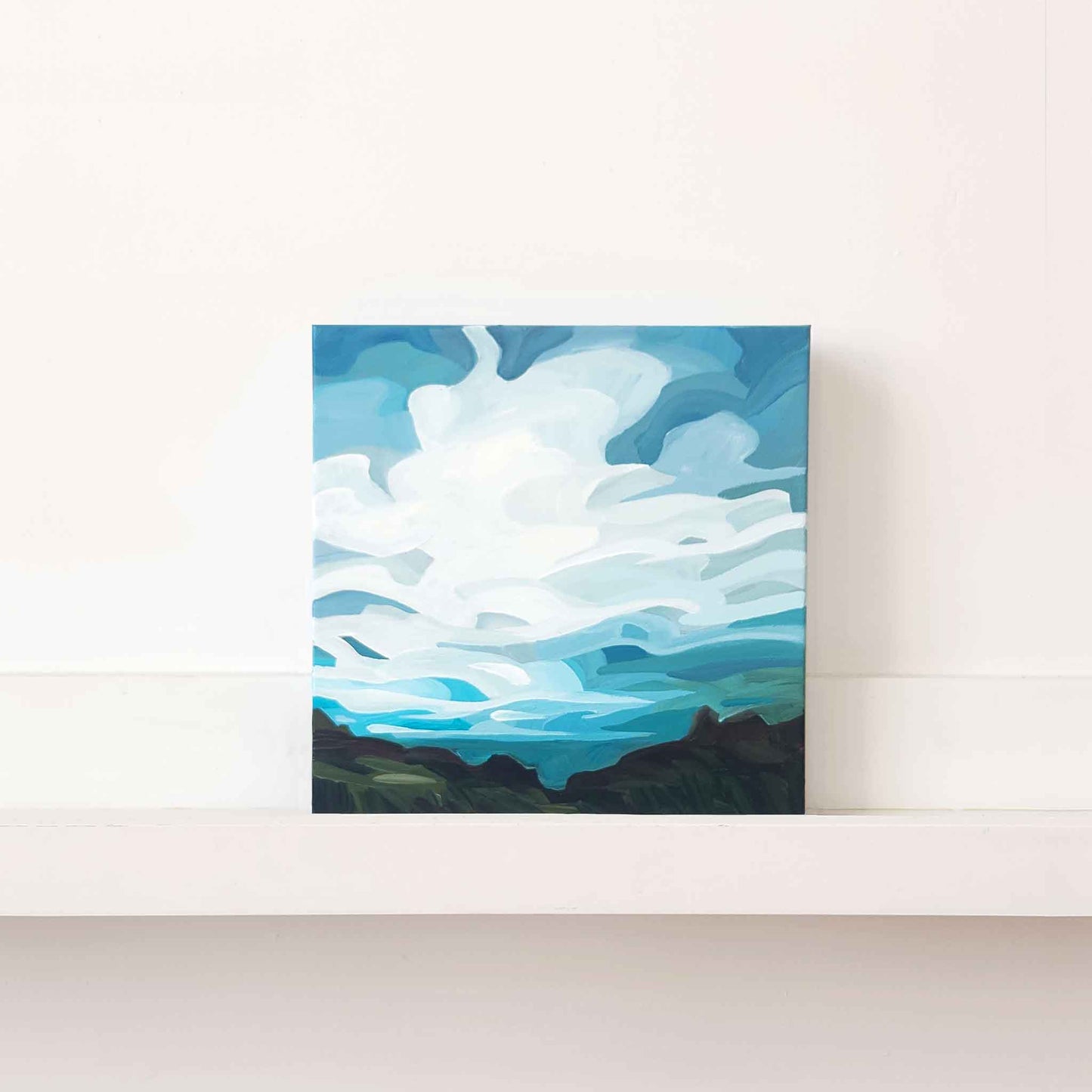 A breezy blue sky painting on gallery-wrapped canvas that captures the calm of a lovely summer afternoon. The light is clear, the air is fresh, and the big white clouds float on a gentle breeze.