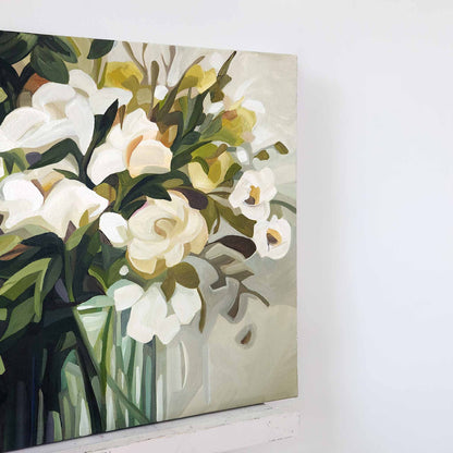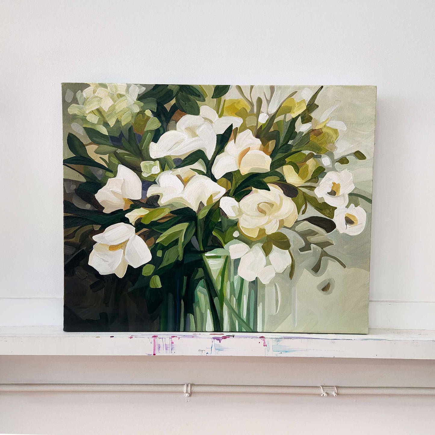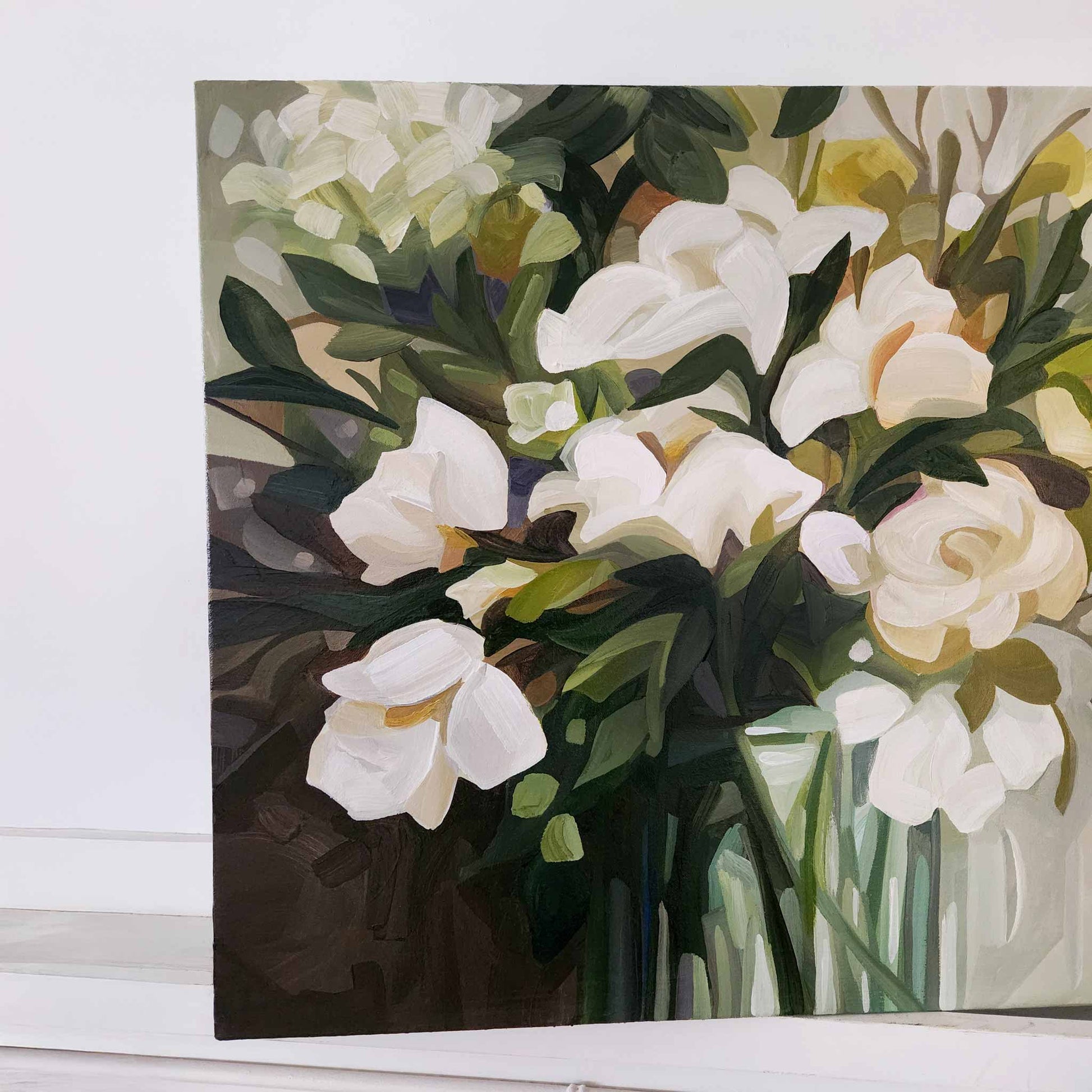 I can honestly say, as pretty as it looks now, this was one of the most challenging paintings in the collection. It sat in the “so close!” stage for a long time, taking extra time, extra paint and all my creative energy to finally squeeze this perfectly lovely bunch out of my imagination and onto the canvas.