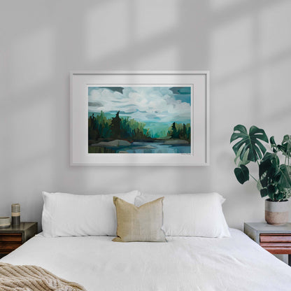 'Longshore' is a wide-format artwork from 'Lakelands', a collection inspired by my deep connection to the outdoors. Each brushstroke evokes memories of tranquil lakes, winding rivers, and unforgettable camping adventures. With 'Longshore' I aim to capture the essence of a thousand shimmering lakes mirroring the sky, framed by untouched forest.