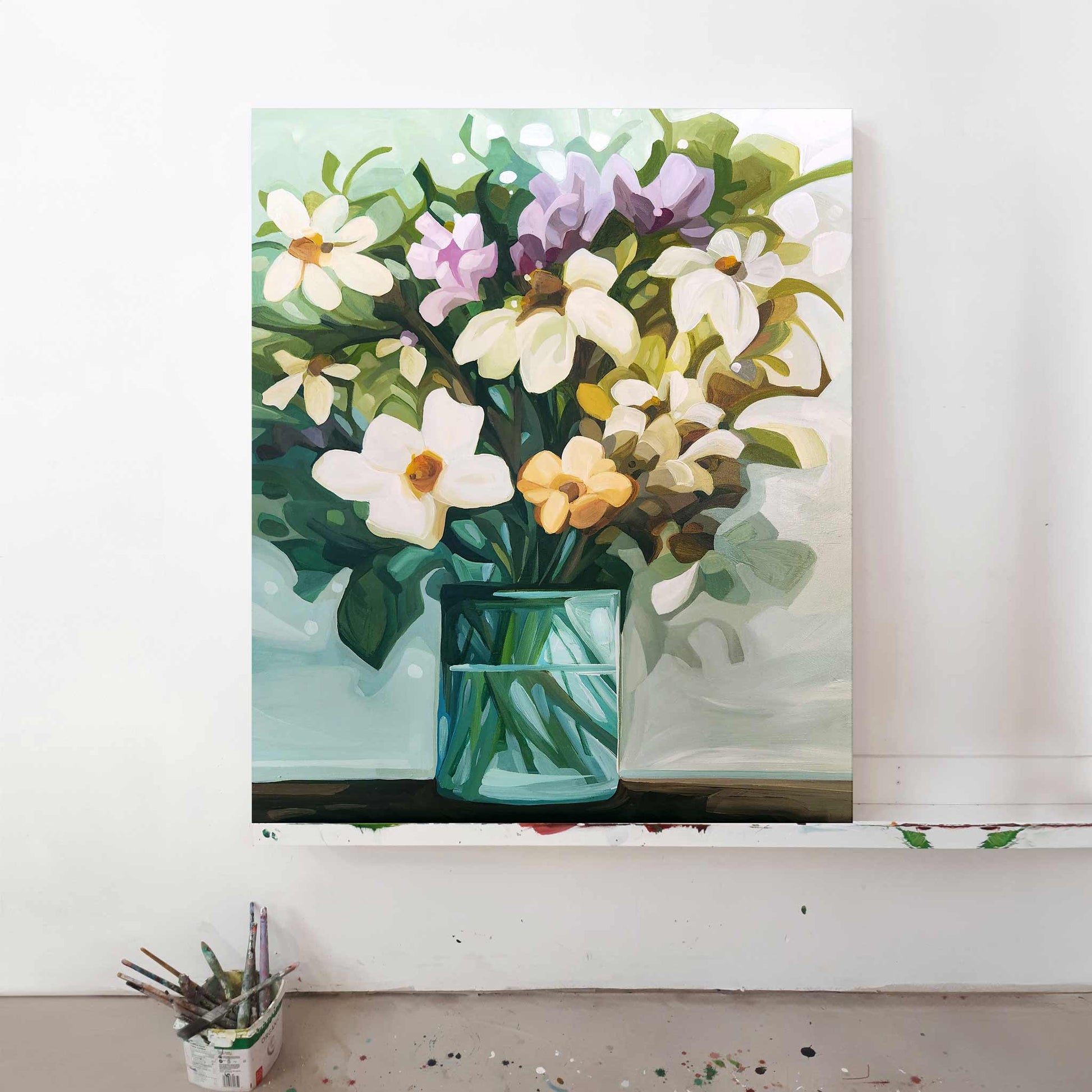 I stop regularly to take pictures (and yes, to stick my nose into her lilac tree!). For all its glory, there’s something gentle about the overall effect, especially the way the wind sways through the leaves. It’s simply lovely, and I used its speckled sunlight and scattering of flowers as inspiration for this light-filled spring bouquet painting.