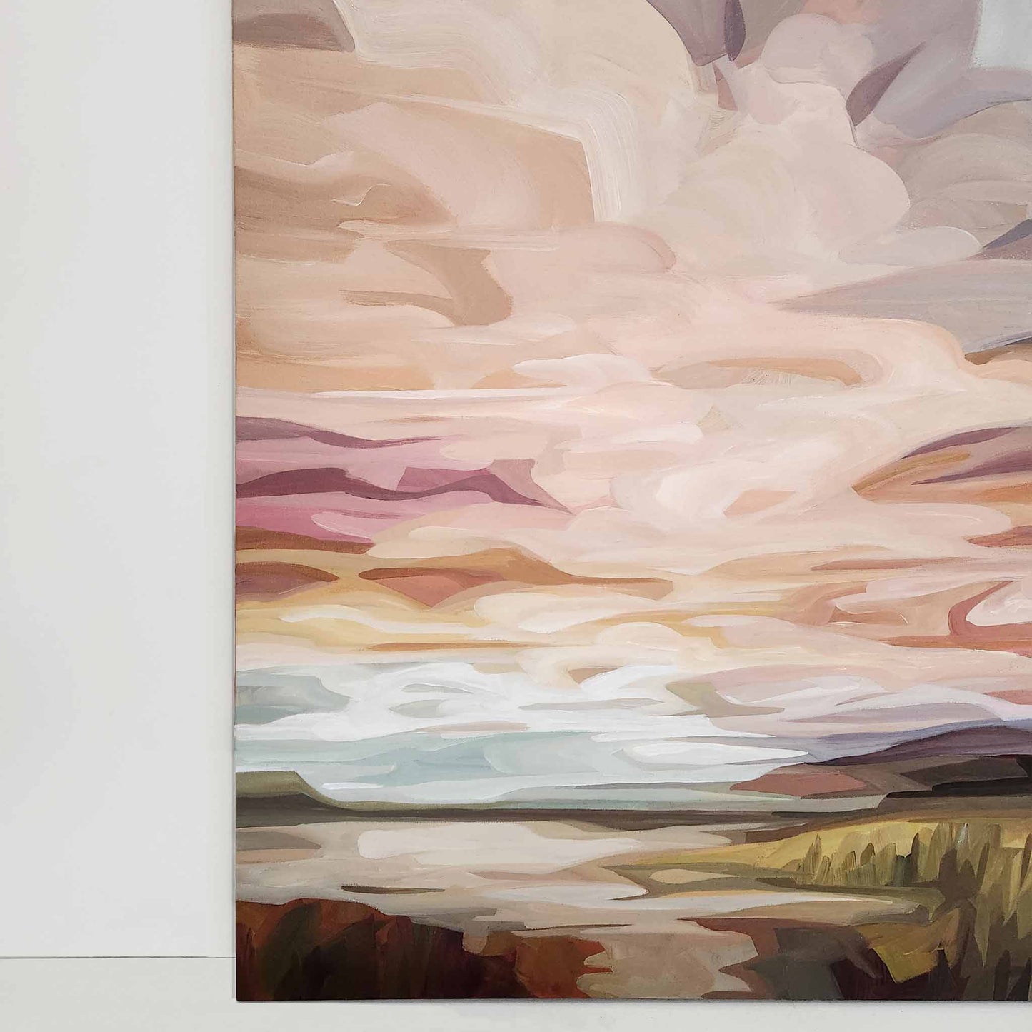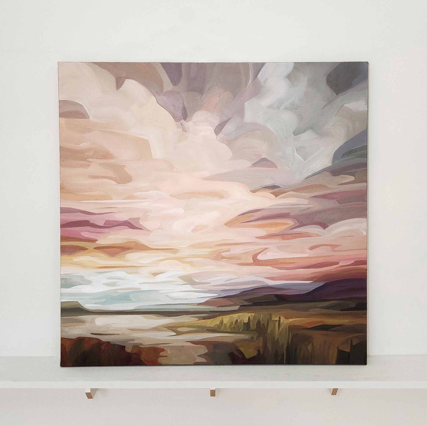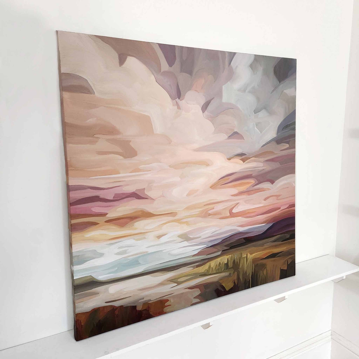 Some days, I travel no further than my imagination for inspiration, and from there... who knows. These are the canvases that consistently surprise me, where each brushstroke is a revelation, and I find myself delving deep into the art of discovery. It all started with 'Summerset,' a name brimming with untapped potential. I could feel it beckoning for softness, warmth, serenity, and perhaps even a touch of peachy delight. With that spark of inspiration, I allowed myself to be carried away into a breathtaking sky that extended beyond any artistic frontier I had ever dared to explore. Along the way, I uncovered a splendid spectrum of new colours concealed in the blending and mixing of delicate pinks, sumptuous mauves, and subtle greys, filling these clouds with remarkable depth, warmth, and emotion. If summer must yield to the embrace of autumn, I wish for it to relinquish itself as 'Summerset'—a magnificent finale painted across the celestial canvas.