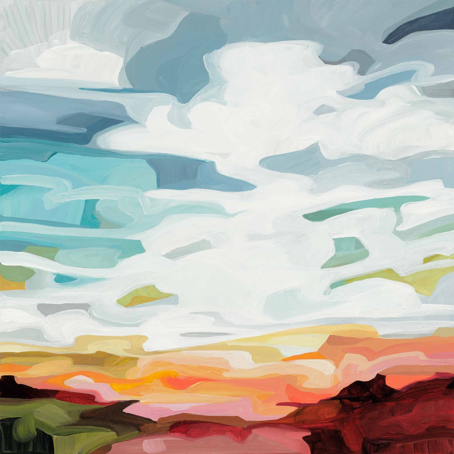 The size shown for a canvas art print is the image size. Your canvas print will arrive rolled with an additional 2” border (white or printed) so you can wrap this around the stretcher frame of your choice. My signature runs vertically up the right side of the border.