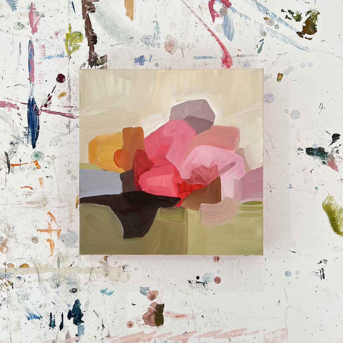 A small painting that weaves together a perfect harmony of elements - a suggestion of sunset, hint of a floral, and a subdued sense of peaceful reflection - all presented in a rich colour palette. The clean lines of the brushstrokes and interplay of abstract shapes create a modern, energetic aura.
