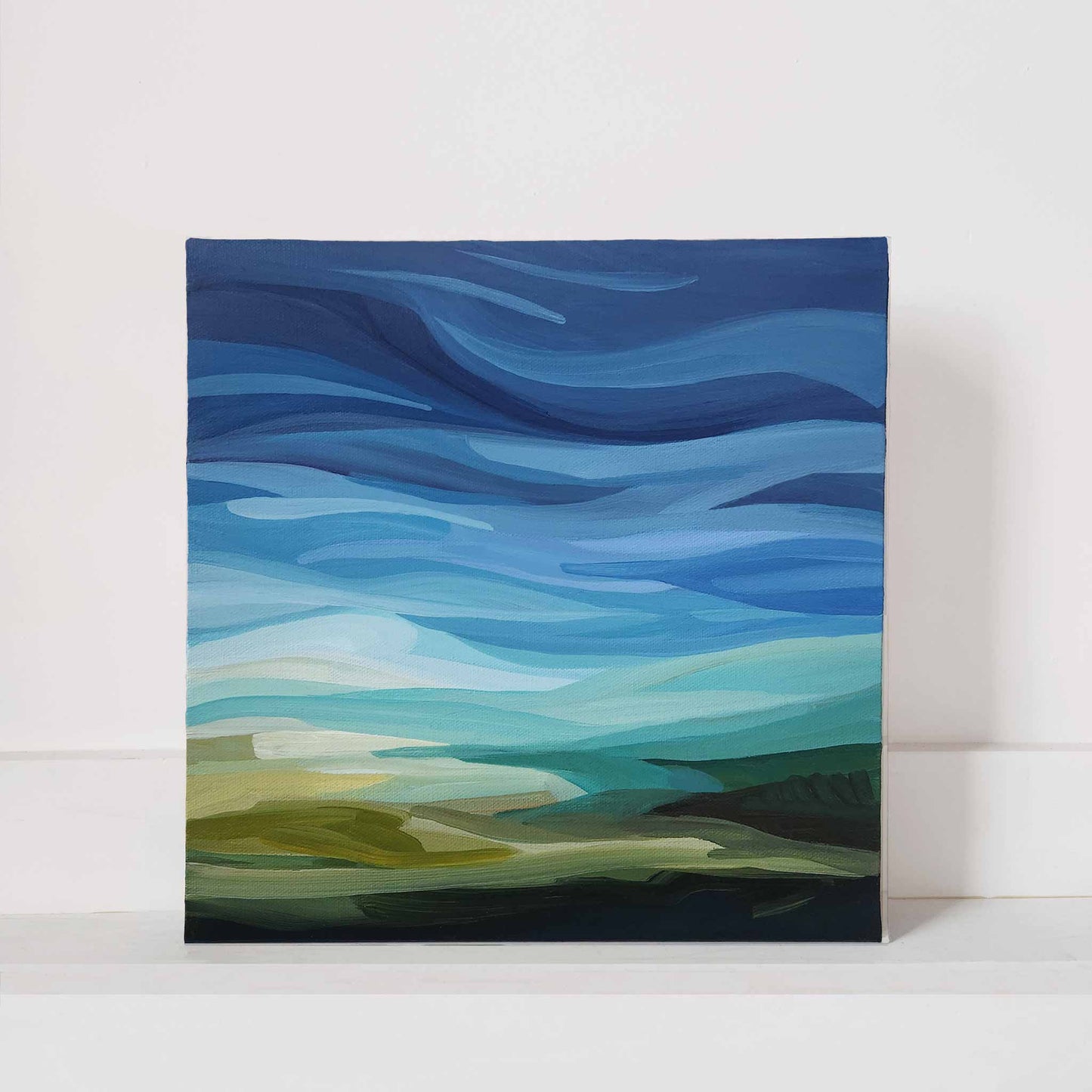 This is the kind of sky I dream of on grey winter days. There's no question that the world comes alive in a wonderful way under the bright light of a glorious summer day. There's a lovely transition here from land to sky, a warm pull of bright light and a soft, playful blend of blues and greens that are at once joyous and calming. It’s a small original painting that will put you in a sunny state of mind.