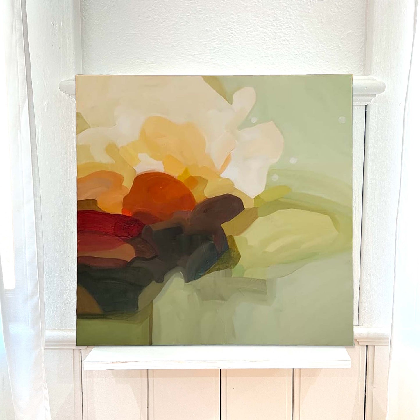 Discover a more subdued version of abstract floral art with this piece. Picture soft, buttery petals gently embracing a deep, rust-colored flower at its heart, all set against a soothing sage green backdrop. The artwork exudes a profound sense of tranquility, infusing any room with the grace of nature and making it a beautiful addition to your collection.
