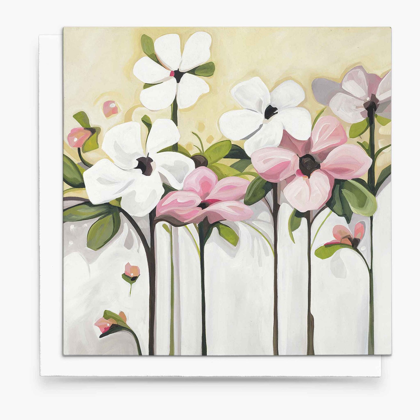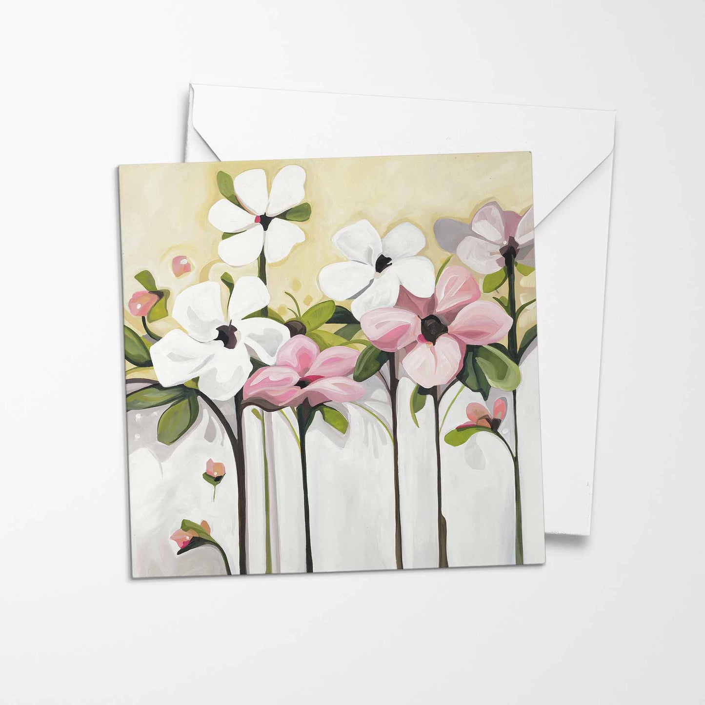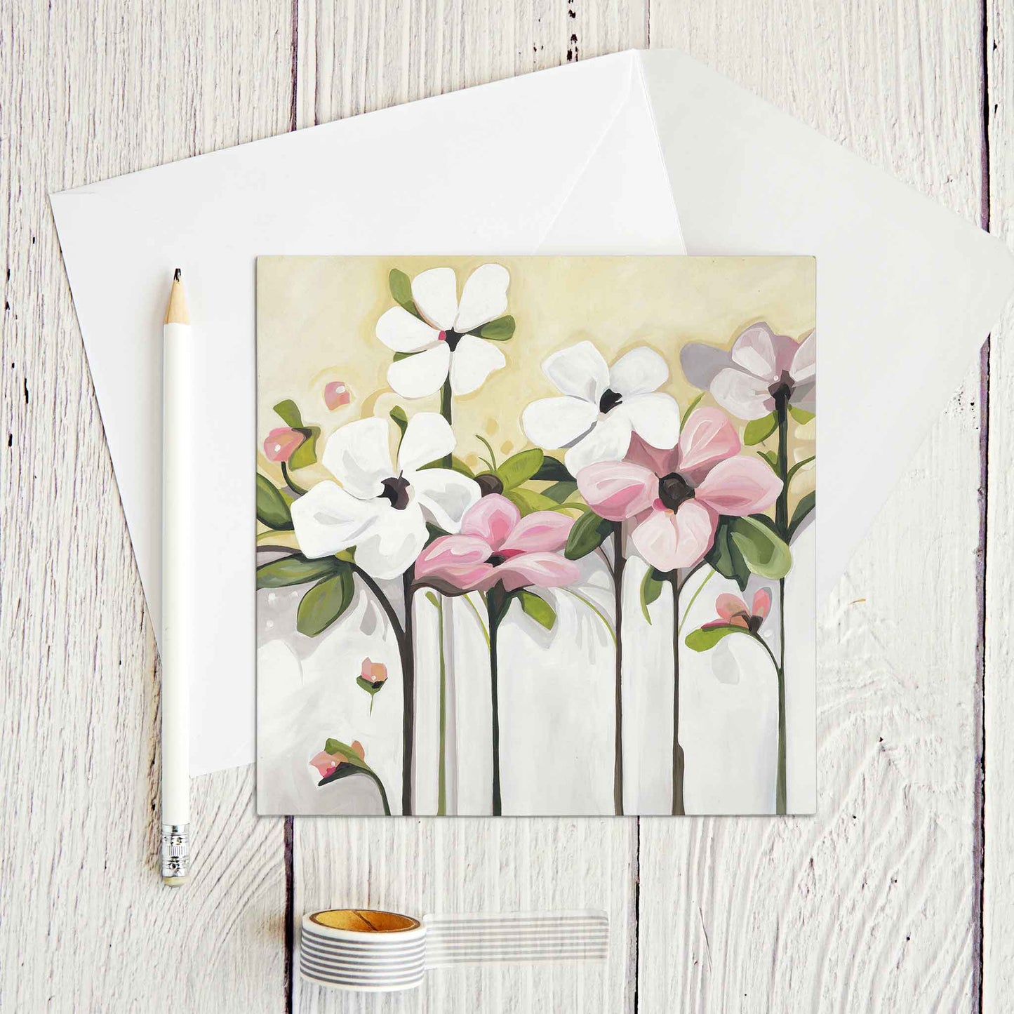 Inspired by the simple beauty of spring flowers in the garden, this fine art greeting card captures a light elegance in the buttery, creamy yellow petals gently offset with touches of peach and white blossoms. It is a card versatile for any occasion but perfect as a wedding card, new baby card or celebration card.
