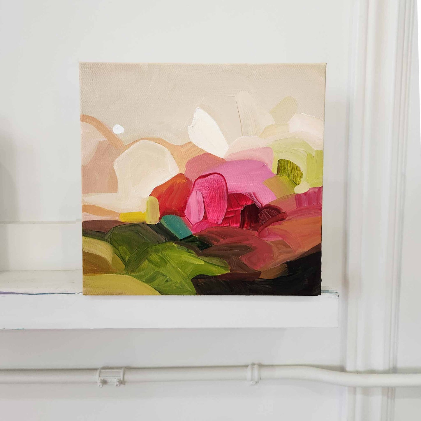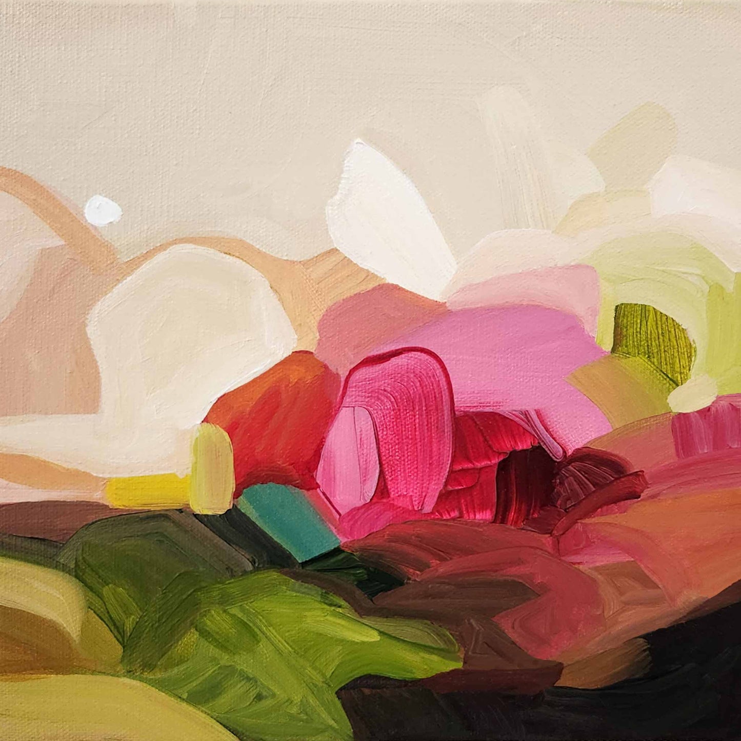 Imagine gazing into the distance and watching a bright pink burst of sun rising above the horizon, or the summer colours in a garden gently swaying in the breeze. In this painting, it could be either. The brushstrokes blend to offer an open-ended narrative and the opportunity to weave your own story into the canvas, leaving room for a deeply personal connection with the artwork.